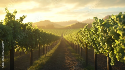 Naklejka premium Vineyard sunset, rolling hills, grape harvest, idyllic landscape, wine industry