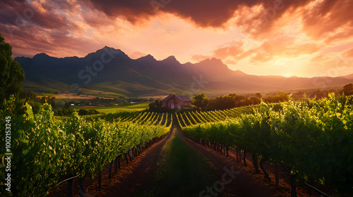 Naklejka premium Vineyard Sunset with Mountain Range in South Africa