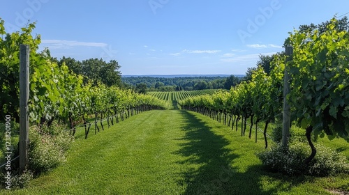 Naklejka premium vineyard under a clear blue sky, with rows of grapevines stretching into the...