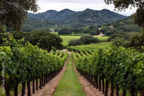 Naklejka premium Vineyard with grapevines and mountain backdrop