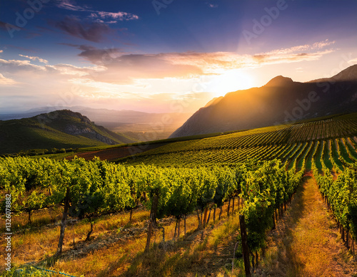 © Mariia, Fototapeta premium vineyard with mountains at sunset