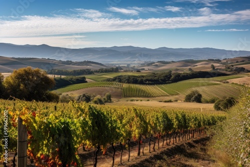 Naklejka premium vineyard with rolling hills and distant mountain ranges in the background,...