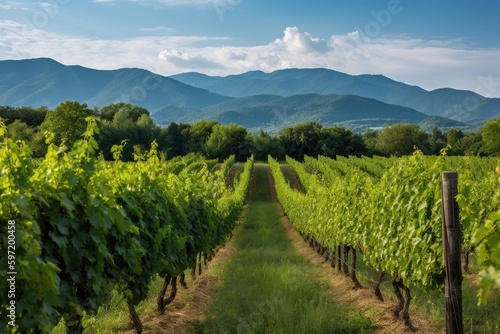 Naklejka premium vineyard with rows of grapevines, bordered by lush foliage and mountains in the background, created with generative ai