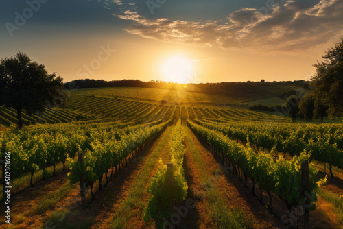 Naklejka premium Vineyard with rows of trees at sunset created with AI