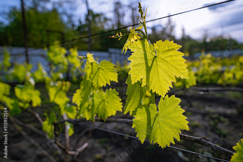 © Inna_Shport, Obraz premium Vineyard with young grape leaves