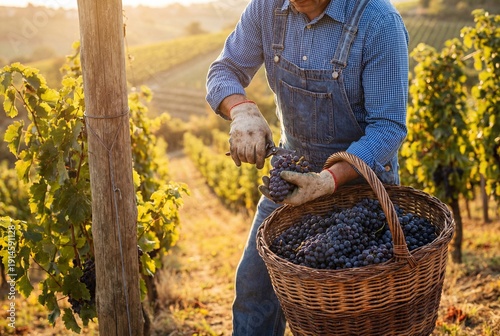 © Meow Creations, Fototapeta premium Vineyard worker harvesting grapes into basket