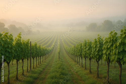 © Midea , Fototapeta premium Vineyard workers harvesting grapes in foggy California valley.