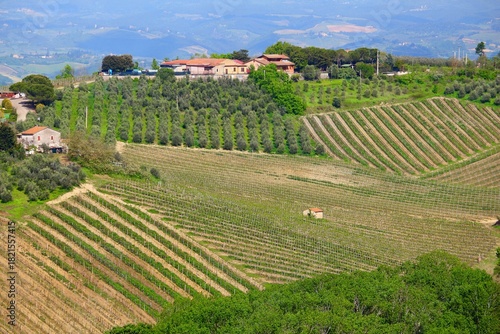 Fototapeta premium Vineyards and olive groves in Tuscany - rural Italy. Agricultural countryside area in the province of Siena.