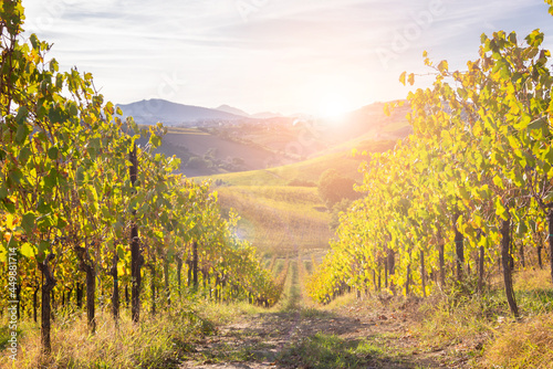 © Maresol, Fototapeta premium Vineyards and winery among hills, countryside landscape