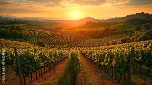 © waok.cepu67, Naklejka premium Vineyards at sunset, rolling hills