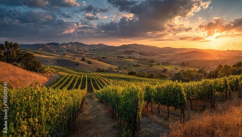 © Slolo, Fototapeta premium Vineyards at sunset, rolling hills