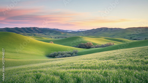 Fototapeta premium Vineyards bloom under a pastel sunset in springtime hills