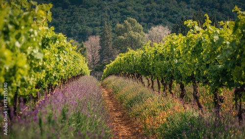 Fototapeta premium Vineyards filled with lush grapes and vibrant flowers, highlighting the rural...