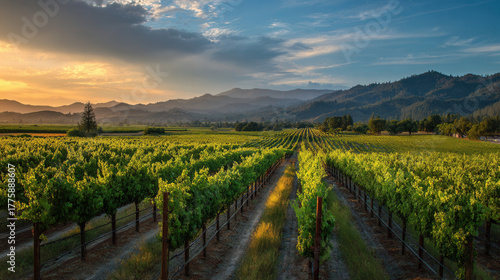 © vasyl pshyk, Fototapeta premium Vineyards stretch across rolling hills under a colorful sunset in Napa Valley, showcasing nature's beauty and agricultural richness