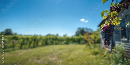 Obraz premium Vinifera grape on an abandoned vine in an old house under a sunny blue sky,...
