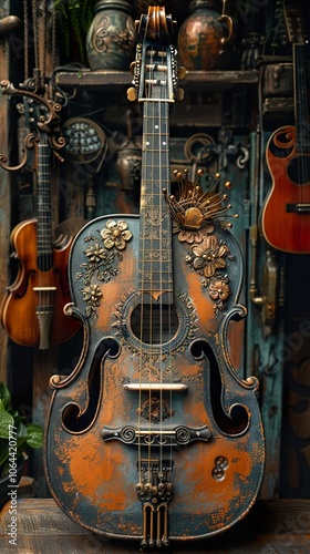 Naklejka premium Vintage Acoustic Guitar with Intricate Design and Ornamentation