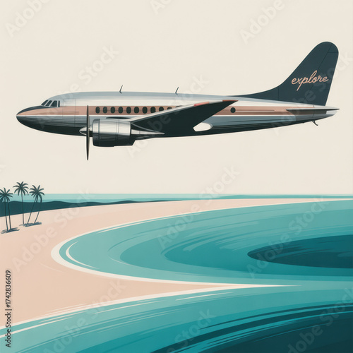 Obraz premium Vintage airplane flying over a tropical beach with palm trees and turquoise ocean Explore