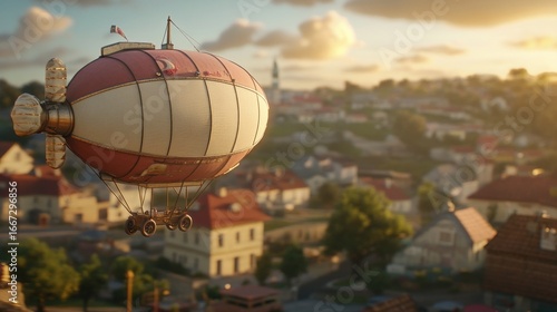 © Bimha, Obraz premium Vintage airship over quaint town at sunrise