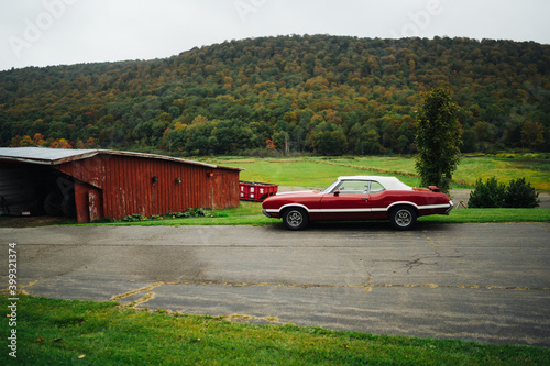 © BullRun, Fototapeta premium Vintage American car near green hill