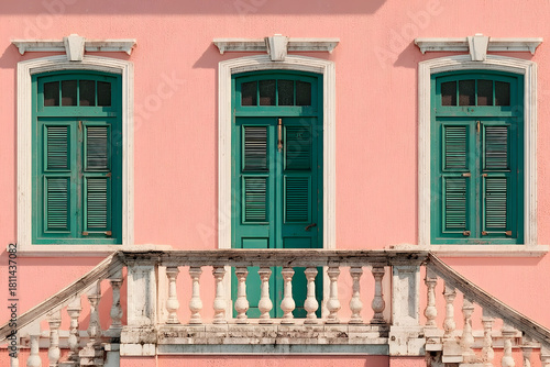 © Masha, Naklejka premium Vintage architecture with green shutters on a pink wall, featuring a classic balustrade