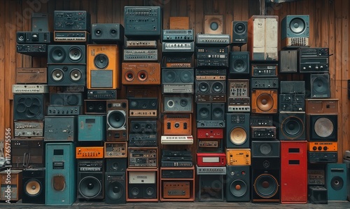 Obraz premium Vintage audio equipment wall, stacked speakers, stereos.