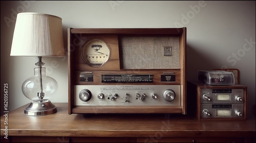 Fototapeta premium Vintage Audio Setup with Radio Receiver, Tape Deck, and Table Lamp in Warm Tones