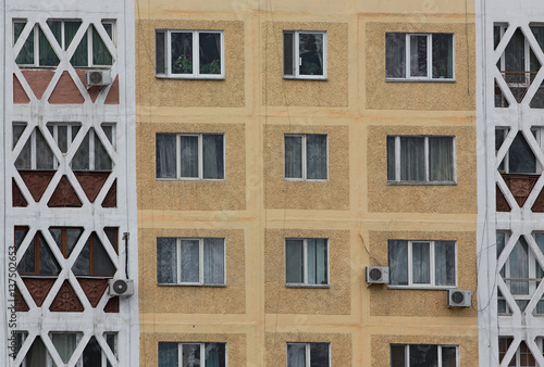 Fototapeta premium Vintage background wall with windows of a multistory building