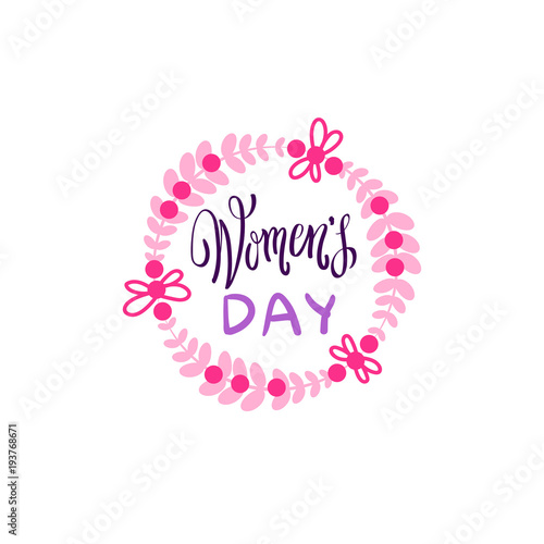 © mast3r, Naklejka premium Vintage Badge Happy Women Day Concept Pink Lettering Calligraphy On White Background Vector Illustration