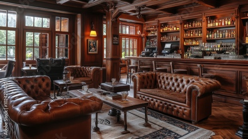 Obraz premium Vintage bar with rich wooden interiors and classic Chesterfield sofas,...