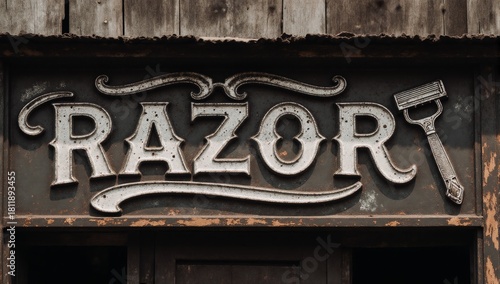 © Pixel Matrix, Obraz premium Vintage barber shop sign featuring a razor and barber pole design