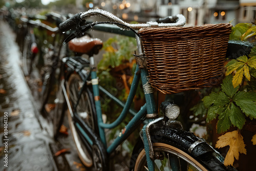 Obraz premium Vintage Bicycle with Basket on Rainy Urban Street for Autumn Designs
