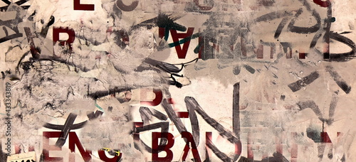 © Alex, Fototapeta premium Vintage Billboard with Torn Poster, Paper, Ads, Stickers Wide Background Or Texture. Urban Creative Wallpaper for Design. Abstract Web Banner. Panoramic Backdrop and Creative Surface.