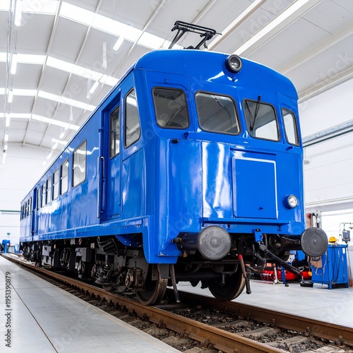 © Adipati, Obraz premium vintage blue electric train in modern maintenance depot bright lighting
