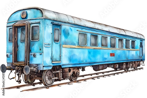 © Biggy, Fototapeta premium Vintage Blue Train Car on Railway Tracks with Artistic Watercolor Style