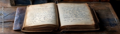 Fototapeta premium Vintage book with handwritten pages resting on a rustic wooden table, evoking...
