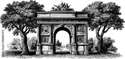 © Artem, Fototapeta premium Vintage botanical city gate engraving - historical architecture sketch for design and decor
