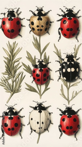 Obraz premium Vintage Botanical Ladybug Study, Ladybugs