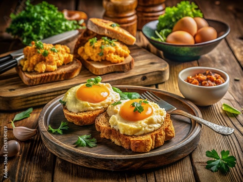 © Danicha, Fototapeta premium Vintage Breakfast: Fried Toast & Four Ways with Chicken Eggs
