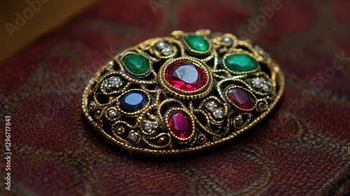 © Boonnam Burart, Obraz premium Vintage brooch with intricate gemstone detailing on a soft pink surface