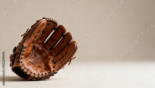 © Ирина , Fototapeta premium Vintage brown leather baseball glove resting on a neutral background, showcasing intricate stitching and craftsmanship, perfect for sports enthusiasts and collectors