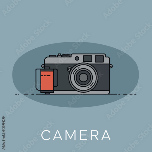 © GMZ, Obraz premium Vintage camera with film roll vector illustration in muted blue background