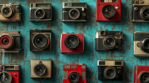 Obraz premium Vintage cameras arranged on a distressed turquoise background