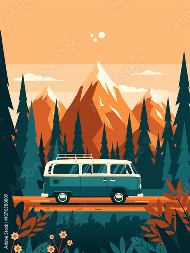 Fototapeta premium Vintage Camper Van on a Scenic Mountain Road - Beautiful Nature Landscape Vector Illustration