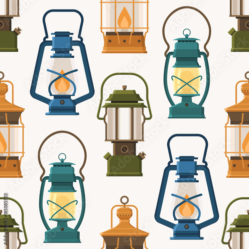 Fototapeta premium Vintage camping lantern pattern in flat design. Retro oil lamps and gas...
