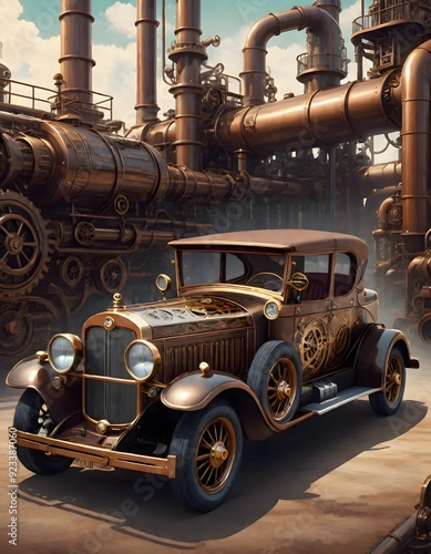 Fototapeta premium Vintage car with a steampunk design, featuring brass and copper elements, set...
