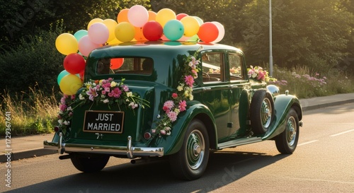 © Anomal, Obraz premium Vintage Car with "Just Married" Sign: Adorned with Balloons & Flowers, Joyful Start of New Journey, Wedding, Celebration, Love, Couple.