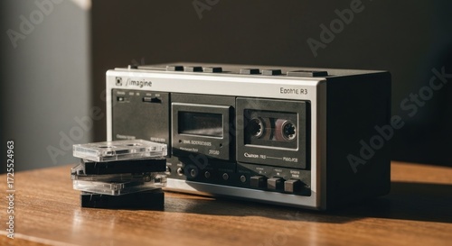 Fototapeta premium Vintage cassette player on a wooden table
