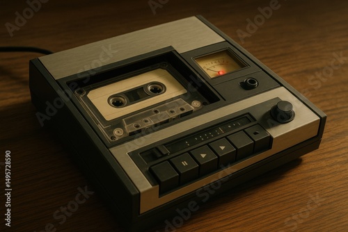 © IbragimovN, Obraz premium Vintage cassette tape player on wooden table with warm lighting