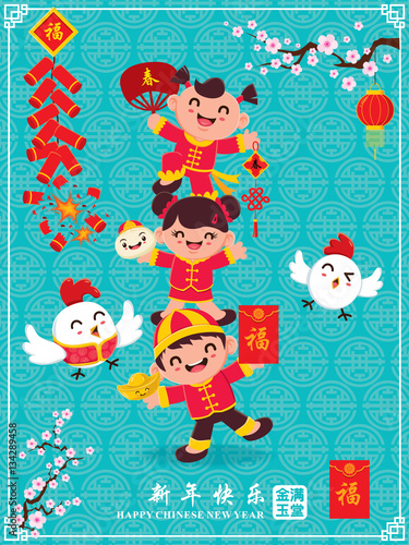 © Sze Wei Wong, Naklejka premium Vintage Chinese new year poster design. Chinese character "Xing Nian Kuai Le" means Happy Chinese new year, "Jing Yu Man Tang" means Wealthy & best prosperous.