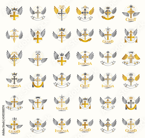 © Sylverarts, Fototapeta premium Vintage Christian crosses vector logos or emblems, heraldic design elements big set, classic style heraldry religion symbols, antique designs.